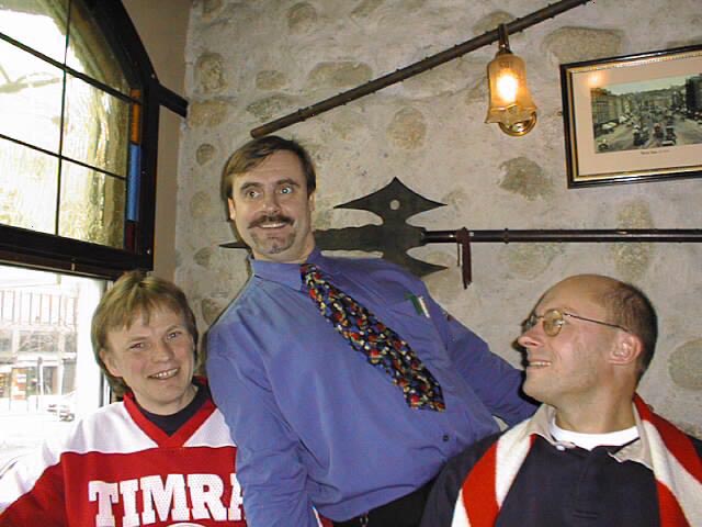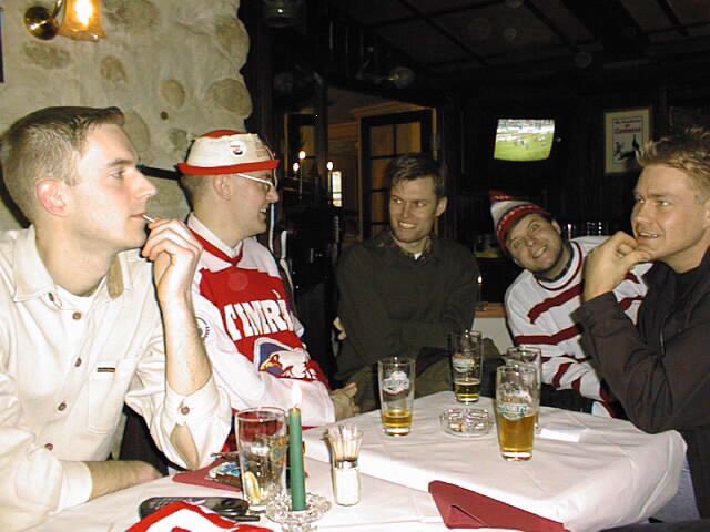 Vår förnämlige servitör "Pekka" (uppkallad efter en inte helt okänd stor-målvakt) omgiven av törstiga supportrar. Andreas, Niklas, Henrik, Nizze och "Mr Tingsryd" lägger upp taktiken.